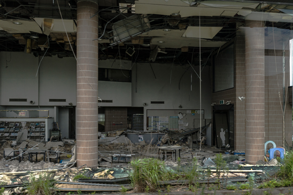 Beginning in 2016 , five years after the disaster , Shozaburo Ishid a spent more than a year photographing the state of things along the road as seen from the bus that substitutes for still-disrupted rail service . Details found even in scenes captured fleetingly through the limited visual range and perspective afforded by the windows of the bus would, he thought, highlight the irrationality of the nuclear accident.
